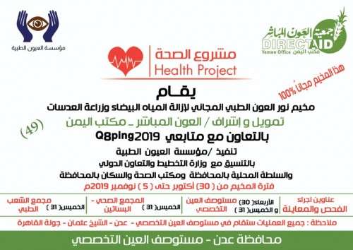 ومن المقرر أن تُجرى جميع العمليات في مستوصف العين التخصصي، الواقع بالقرب من جولة القاهرة، في مديرية الشيخ عثمان بمحافظة عدن.