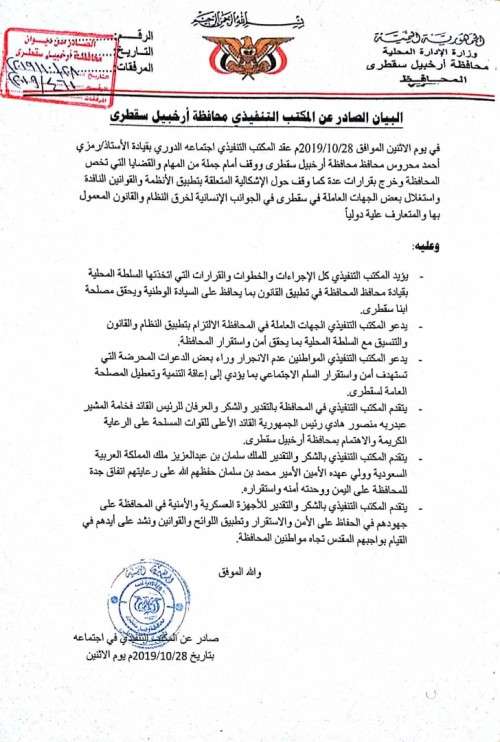 كما ايد المكتب التنفيذي سقطرى كل الإجراءت والخطوات والقرارات التي اتخدتها السلطة المحلية بقيادة المحافظ محروس في تطبيق القانون بما يحافظ على السيادة الوطنية ويحقق مصلحة ابناء سقطرى.