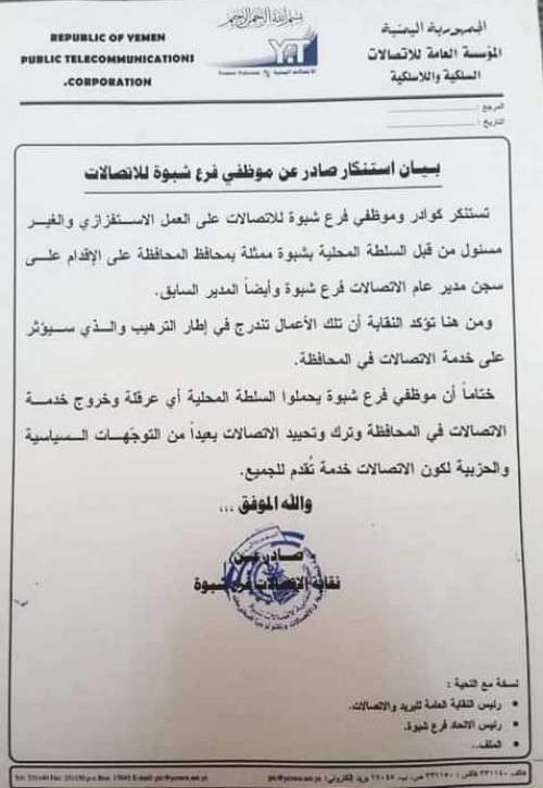 وأصدرت نقابة الاتصالات فرع محافظة شبوة بيان استنكار على العمل الاستفزازي والغير مسؤول من قبل السلطة المحلية بالمحافظة باعتقال وسجن المدير العام للاتصالات وأيضاً المدير السابق بحسب ماجاء في البيان.
