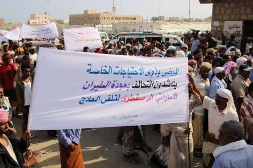 و ناشد المحتجون من أبناء سقطرى التحالف العربي والحكومة الشرعية لاعادة الخط الجوي لشركة رويل جت الإماراتية في القريب العاجل ودون تأخر مؤكدين أن أي تأخير يلحق بأضرار ويزيد من معاناة اهالي ومواطني سقطرى.