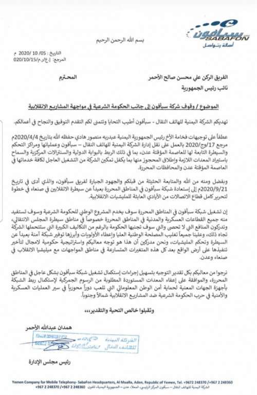 A marching document addressed to the Vice President, Lieutenant General Ali Mohsen Al-Ahmar of the SabaFon Company, revealed the level of military coordination for the arrival of SabaFon services in the areas controlled by the Transitional Council, and the need to facilitate its tasks in order to serve the military orientations of the legitimate government.
