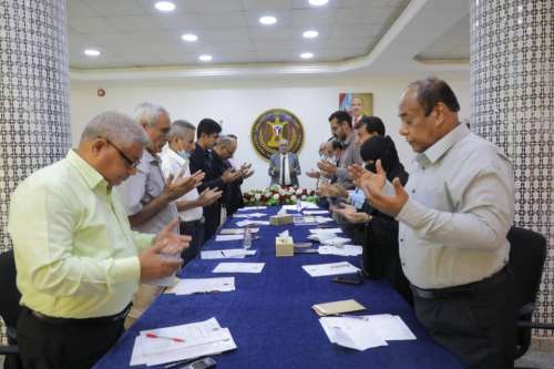وفي مستهل الاجتماع، وقف الحاضرون دقيقة حداد لقراءة سورة الفاتحة على أرواح الشهداء الذين قضوا في الاعتداء الذي نفذته مليشيات الحوثي الإرهابية على المعسكر التدريبي في قاعدة العند، مبتهلين إلى المولى تعالى بأن يمنّ على الجرحى بالشفاء العاجل.