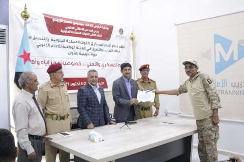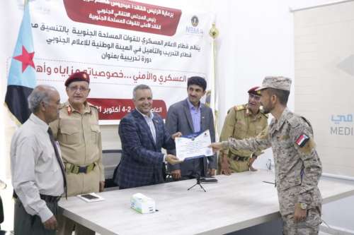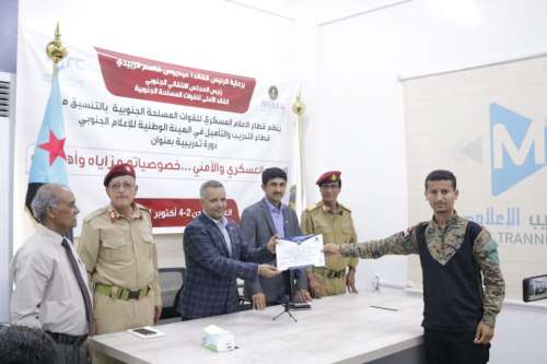 مركز الإعلام العسكري وقطاع التدريب والتأهيل في الهيئة الوطنية للإعلام الجنوبي يختتمان الدورة التدريبية لمنتسبي التوجيه المعنوي