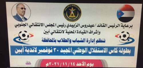 برعاية الرئيس القائد عيدروس الزُبيدي وتنظيم القيادة المحلية للمجلس الانتقالي تقام يوم غدا الاثنين مباراتين ضمن بطولة كأس الاستقلال الوطني 30 نوفمبر لأندية محافظة أبين .