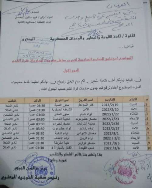 وبعد إجراء القرعة بين الفرق الرياضية للألوية والوحدات العسكرية، أعلنت اللجنة المنظمة للفعاليات الرياضية موعد بدء أنطلاقة الدور الأول لبطولة كرة القدم وذلك يوم السبت الموافق 19 فبراير 2022م، تليها بطولة كرة الطائرة يوم الأحد الموافق 20 فبراير 2022م.