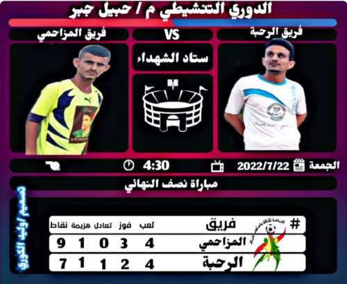 يلعب عصر الجمعة القادمة في مواجهة واعدة فريقا الرحبة والمزاحمي في مباراة النصف النهائي الاول من البطولة التنشيطية لكرة القدم للفرق الشعبية التي ينظمها نادي شباب حبيل جبر الرياضي بالتنسيق مع مكتب الشباب والرياضة والمقامة على ملعب الشهداء بالمديرية فيما يلعب في لقاء النصف النهائي الثاني عصر السبت فريقا اتحاد الجنوب واتحاد الركب_الدهرشية .