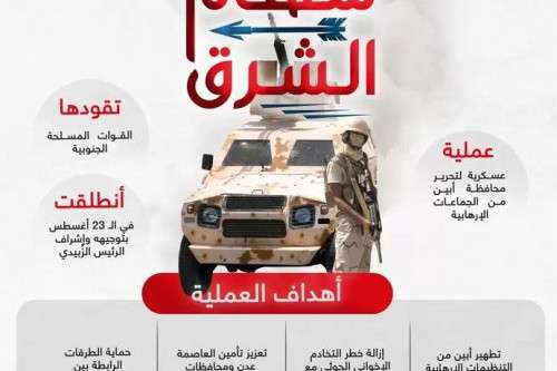 The military operation, dubbed "Arrows of the East", aims to purify Abyan governorate of terrorist organizations and remove the threat of the Houthi Brotherhood's conflict with Al-Qaeda, in addition to strengthening the security of the capital, Aden.