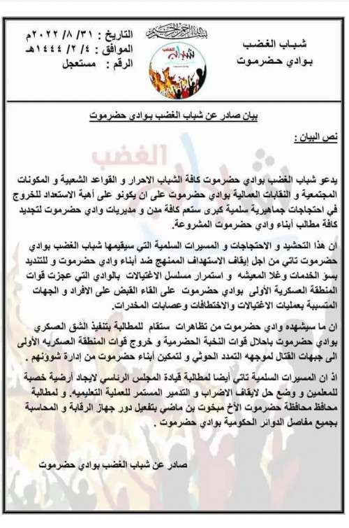 The Youth of Rage in Hadhramout Valley issued an important statement today, Wednesday, August 31, 2022, in which they call in all free youth, popular bases, societal components and trade unions in Hadhramout Valley to prepare to go out in major peaceful mass protests to permeate all cities and districts of Hadhramout Valley.