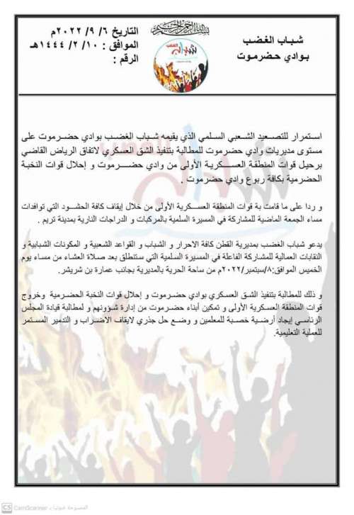 The Youth of Rage in Al-Qatn Directorate announced yesterday evening, on Tuesday, September 6, in 2022, the first steps of the peaceful and popular escalation in Al-Qatn Directorate to demand the implementation of the military part of Riyadh Agreement, which stipulates the departure of the forces of the First Military District from Hadhramout Valley and the replacement with the Hadhrami Elite Forces and the management of their militarily and administratively affairs, and requesting the Presidential Council to find a fertile ground for teachers and develop a solution to stop the strike and the continuous destruction of the educational process .