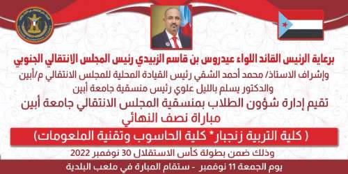 وتدعو منسقية المجلس الانتقالي بجامعة أبين محبي وعشاق الساحرة المستديرة لمؤازرة الفريقين .