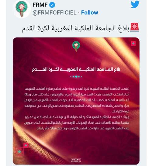 ونشر الاتحاد المغربي بياناً في "تويتر"، احتج فيه على القرارات التحكيمية التي اتخذها الحكم المكسيكي، سيزار أرتورو راموس بالازويلوس، مشيراً إلى أن الاتحاد أرسل رسالة الى الهيئة المختصة تضمنت الحالات التحكيمية التي حرمت المنتخب المغربي ضربتي جزاء "واضحتين"، بحسب مختصين بمجال التحكيم.