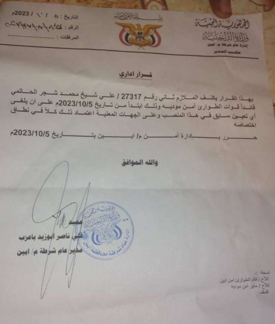 يكلف الملازم ثاني/ علي شيخ محمد شجر الحاتمي قائداً لقوات الطوارئ أمن مودية ابتداءً من تاريخ 5 / 10 / 2023م على ان يلغى اي تعيين سابق في هذا المنصب وعلى الجهات المعنية اعتماد ذلك كلاً في نطاق اختصاصه.