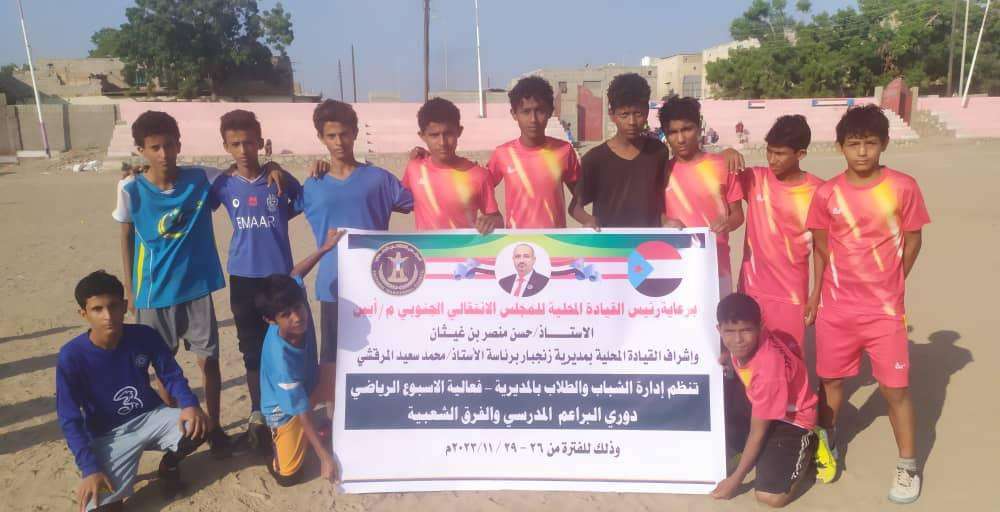 دشن قسم الشباب والرياضة في الهيئة التنفيذية للقيادة المحلية للمجلس الانتقالي الجنوبي بمديرية زنجبار في محافظة أبين، يوم الإثنين، في ملعب الفقيد نصيب عوض، بطولة كرة القدم السباعية لمدارس للتعليم الأساسي في المديرية.