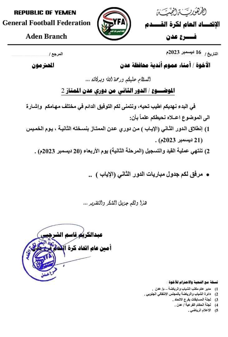 كما خاطب الإتحاد جميع الأندية العدنية العشرة ان عملية القيد والتسجيل تنتهي يوم الأربعاء الموافق 20 ديسمبر القادم، على أن مباريات الجولة يومي الخميس والجمعة القادمين.