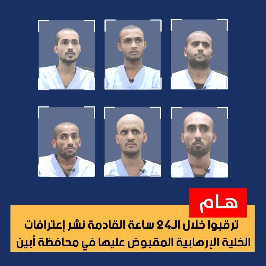 أعلنت إدارة أمن أبين في صفحتها الرسمية أنها ستقوم خلال ٢٤ الساعة القادمة بنشر اعترافات الخلية الإرهابية المقبوض عليه من قبل إدارة أمن أبين .