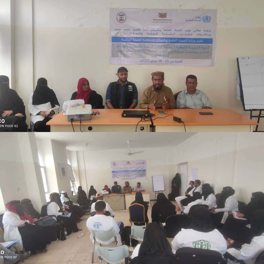 اختتمت بمديرية خنفر في محافظة أبين، دورة تدريبية تهدف لتعزيز المعالجة التكاملية لحالات الحصبة والدفتيريا والسعال الديكي، بالإضافة إلى توفير مقدمة تعريفية عن الكوليرا للشركاء (BHA) وللكوادر الصحية في المحافظة.