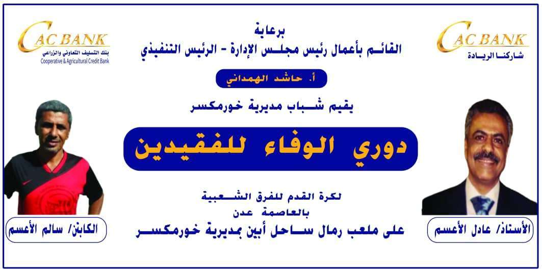 برعاية القائم بأعمال رئيس مجلس الإدارة، الرئيس التنفيذي لكاك بنك، الأستاذ حاشد محمد الهمداني ، يقيم شباب خور مكسر غدا الأحد بطولة دوري الوفاء للفقيدين الاستاذ عادل الأعسم والكابتن سالم الأعسم لكرة القدم للفرق الشعبية.