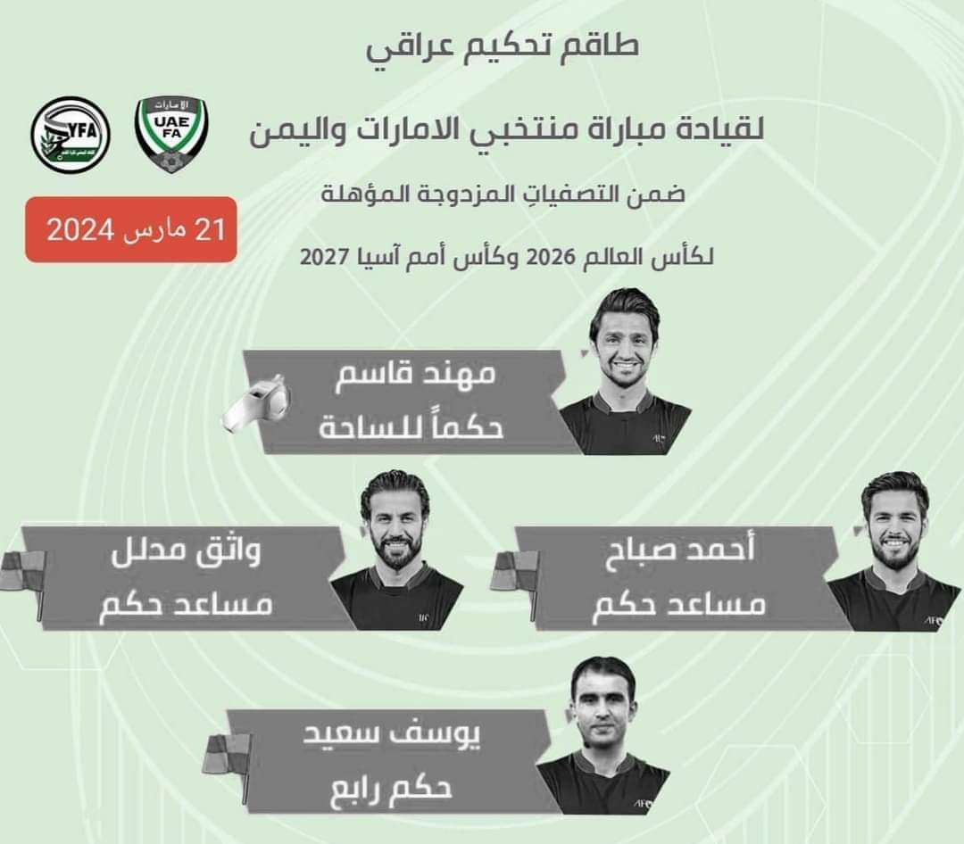 كشفت لجنة الحكام بالاتحاد الآسيويّ لكرة القدم، عن طاقم تحكيمي عراقي لقيادة مباراة منتخبي اليمن والإمارات ضمن التصفياتِ المزدوجة المؤهلة لكأس العالم 2026 وكأس أمم آسيا 2027.