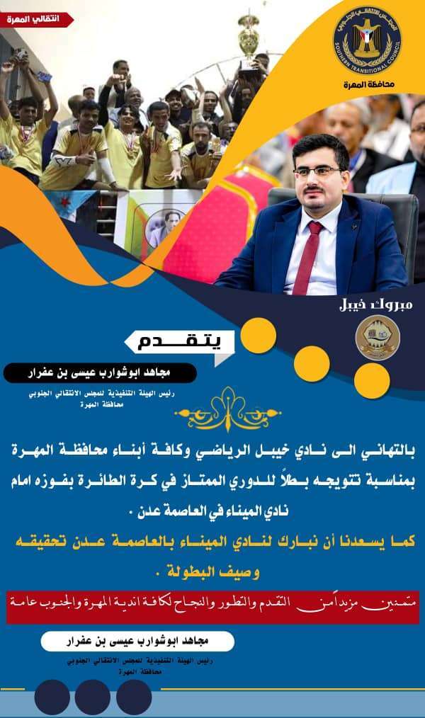 وقال بن عفرار: نتقدم بالتهاني الى نادي خيبل الرياضي وكافة أبناء محافظة المهرة بمناسبة تتويجه بطلاً للدوري الممتاز في كرة الطائرة بفوزه أمام نادي الميناء في العاصمة عدن .
