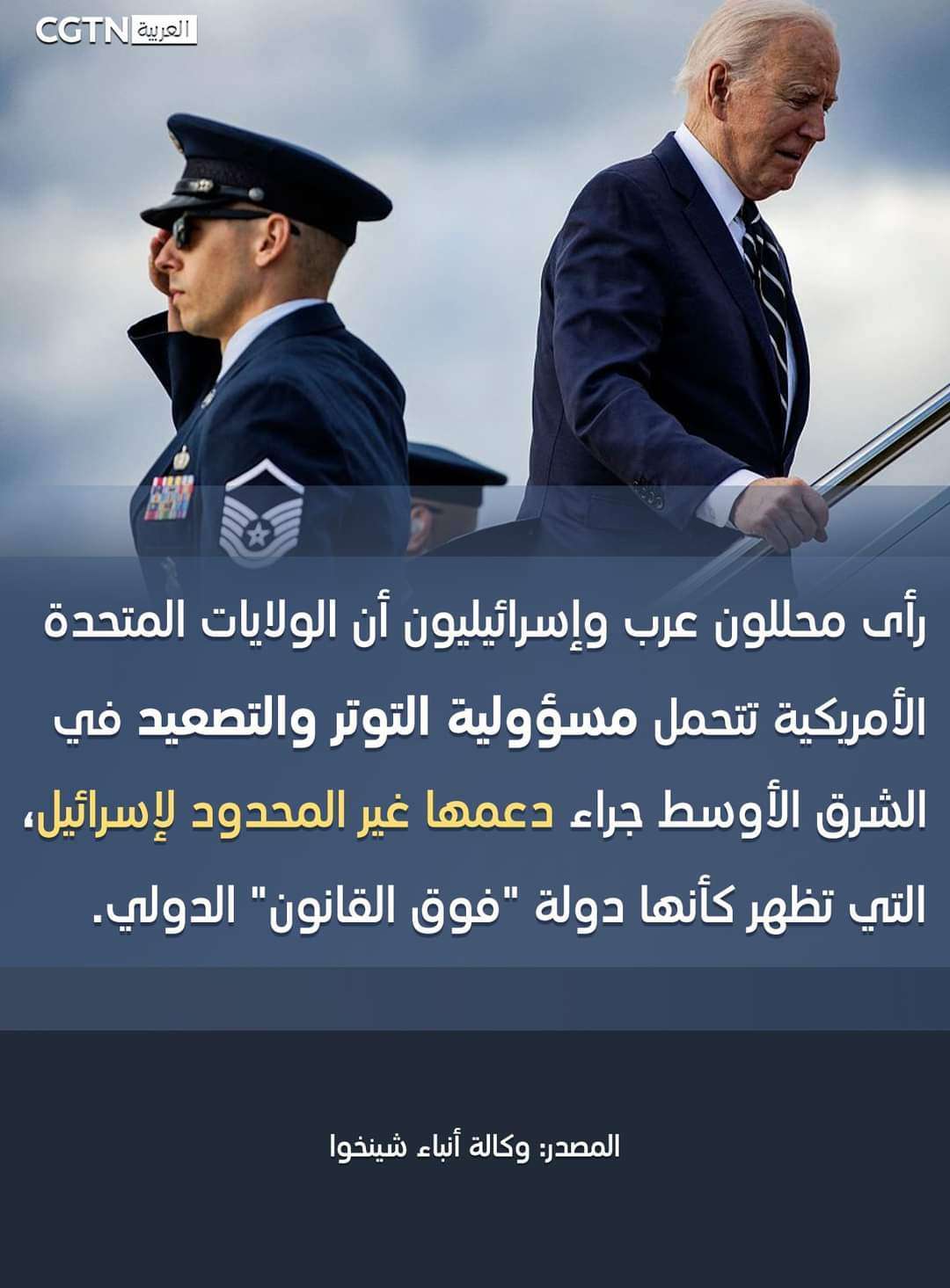 رأى محللون عرب وإسرائيليون أن الولايات المتحدة الأمريكية تتحمل مسؤولية التوتر والتصعيد في الشرق الأوسط جراء دعمها غير المحدود لإسرائيل، التي تظهر كأنها دولة "فوق القانون" الدولي.