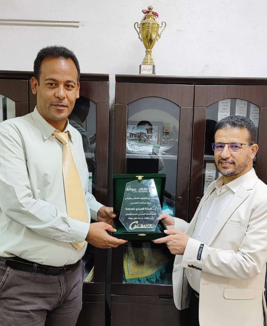 وقام مدير فرع «كاك بنك» بشبوة أحمد الجبيلي، بتكليف من القائم بأعمال رئيس مجلس الادارة، الرئيس التنفيذي الاستاذ حاشد الهمداني، صباح اليوم بتكريم شركة العماري للصرافة، حيث تسلم الدرع التكريمي خليل العماري، معبر عن سعادته بالتكريم الذي حصلت عليه الشركة، مشيداً بالوقت نفسه بالتعاون المشترك بين «كاك بنك» وشركة العماري، متمنياً تقديم الأفضل وتعزيز الشراكة بشكل أكبر في المستقبل.