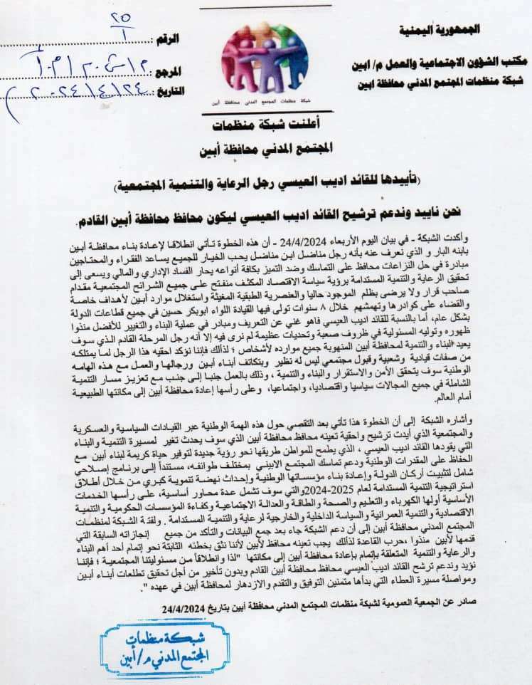 أعلنت الجمعية العمومية لشبكة منظمات المجتمع المدني بمحافظة أبين ، دعمها الكامل لجهود المناضل اديب العيسي ، وترشيحها للعيسي بأن يتولى قيادة محافظة أبين.