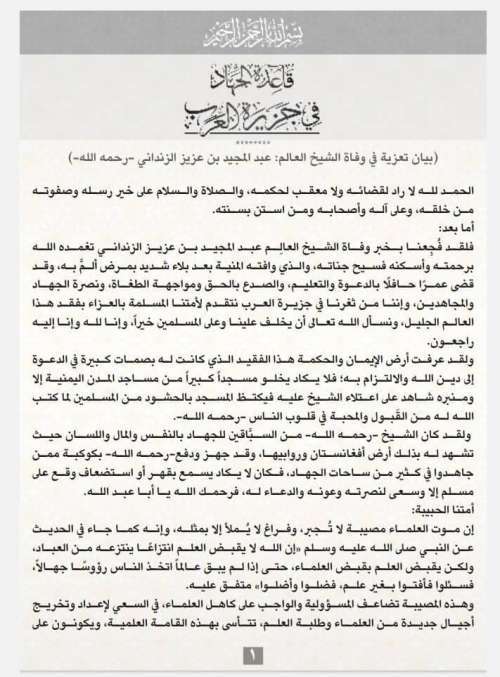 وجاء فيه: تنظيم #القاعدة_الارهابي في جزيرة العرب يعزي وينعي موت المقبور عبد المجيد الزنداني واصفاً الحدث بالفاجعة والمصيبة، ويُشيد بيان التنظيم بمشاركة الزنداني في حرب أفغانستان”.