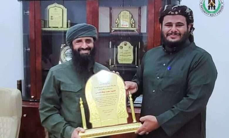 كرم القائد العام لقوات الحزام الأمني، العميد محسن بن عبد الله الوالي، اليوم، المهندس محمد الحبهي، المدير السابق للإدارة العامة للمشاريع الهندسية بقوات الحزام الأمني، بدرع الحزام، وذلك تقديرًا لجهوده المبذولة خلال سنوات عمله.