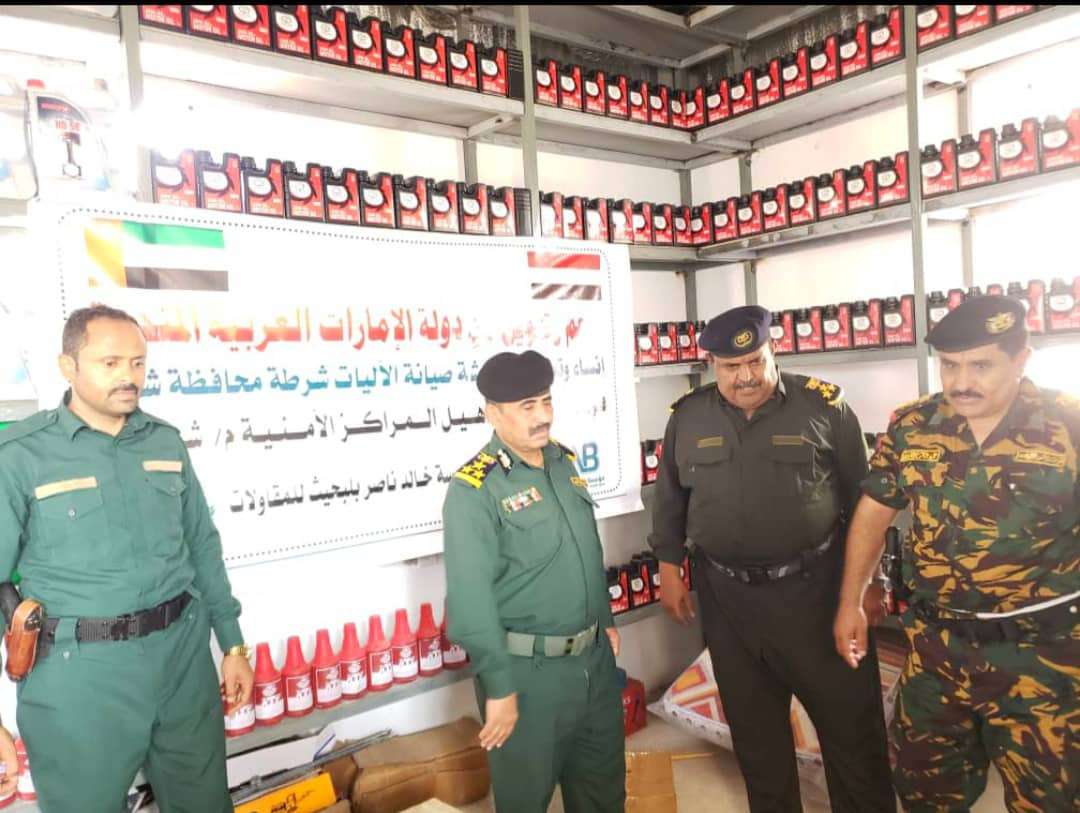 ضمن جهود محافظ محافظة شبوة رئيس اللجنة الأمنية الشيخ عوض محمد ابن الوزير" واستمرارا للدعم السخي للإشقاء في دولة الإمارات العربية المتحدة" وذلك ضمن مشروع تطوير المنظومة الأمنية بمحافظة شبوة، افتتح مدير عام شرطة محافظة شبوة، العميد الركن فؤاد محمد النسي" صباح اليوم الأربعاء، ورشة صيانة الآليات لشرطة المحافظة، والتي تأتي بتمويل من الأشقاء في دولة الإمارات العربية المتحدة، ضمن إطار مشروع تأهيل المراكز الأمنية لشرطة المحافظة.