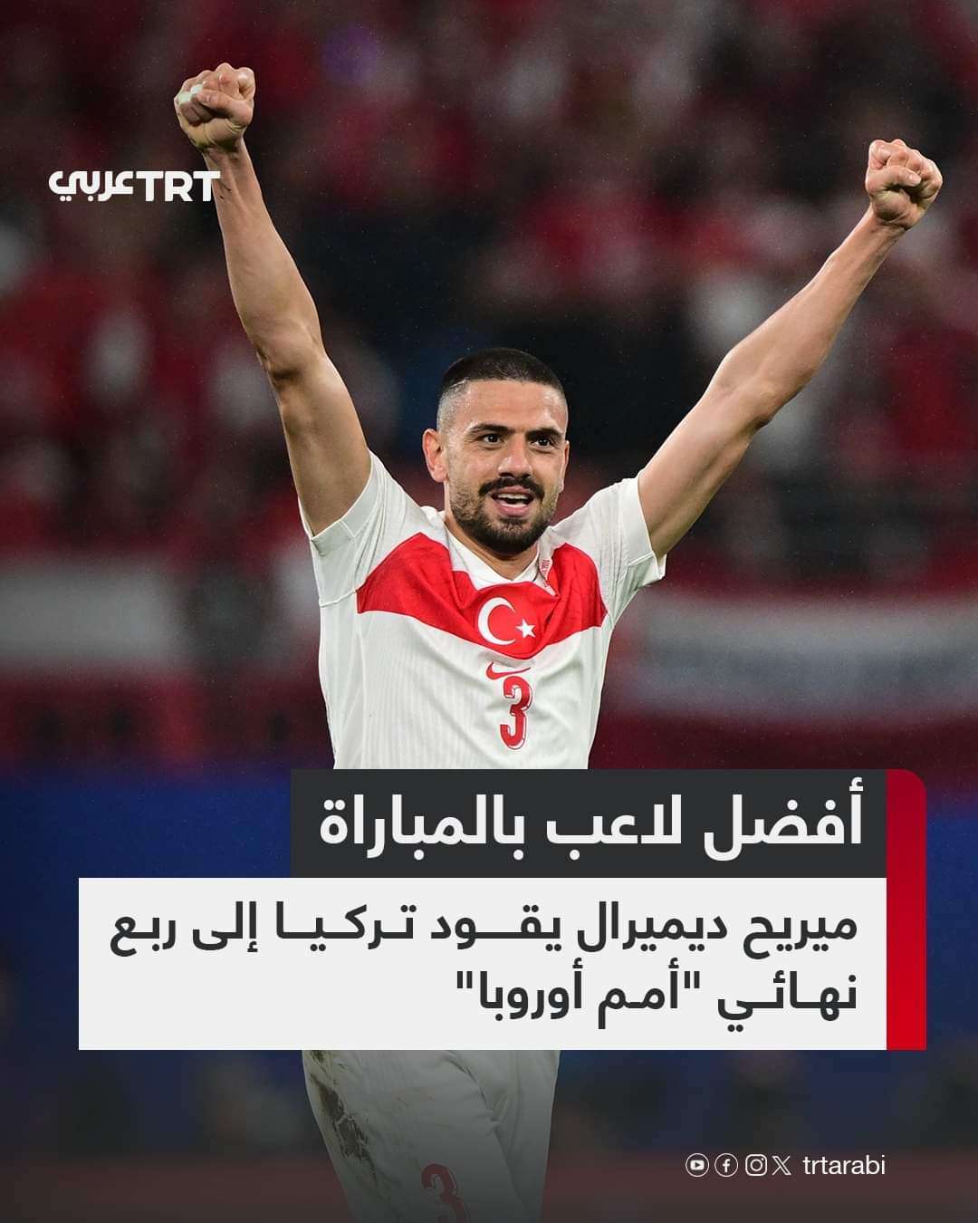 فاز اللاعب الدولي التركي ميريح #ديميرال بلقب "أفضل لاعب في المباراة" لقيادته #منتخب_تركيا لكرة القدم إلى ربع نهائي بطولة أمم أوروبا (#يورو_2024) بعد تسجيله هدفين أمام المنتخب النمساوي الذي سجّل هدفاً واحداً في ثمن النهائي.