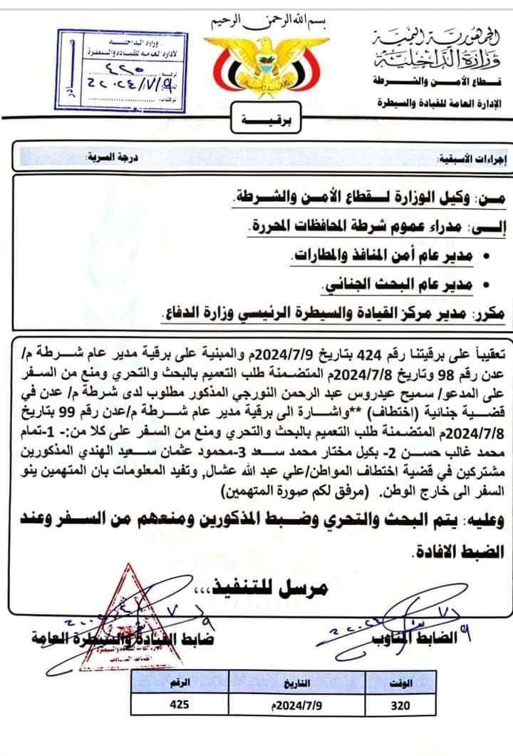 أصدرت وزارة الداخلية اليمنية، اليوم الثلاثاء، تعميماً عاجلاً لجميع الوحدات الأمنية في المحافظات المحررة، بالبحث والتحري عن ثلاثة أشخاص متهمين بقضية اختطاف في محافظة عدن..