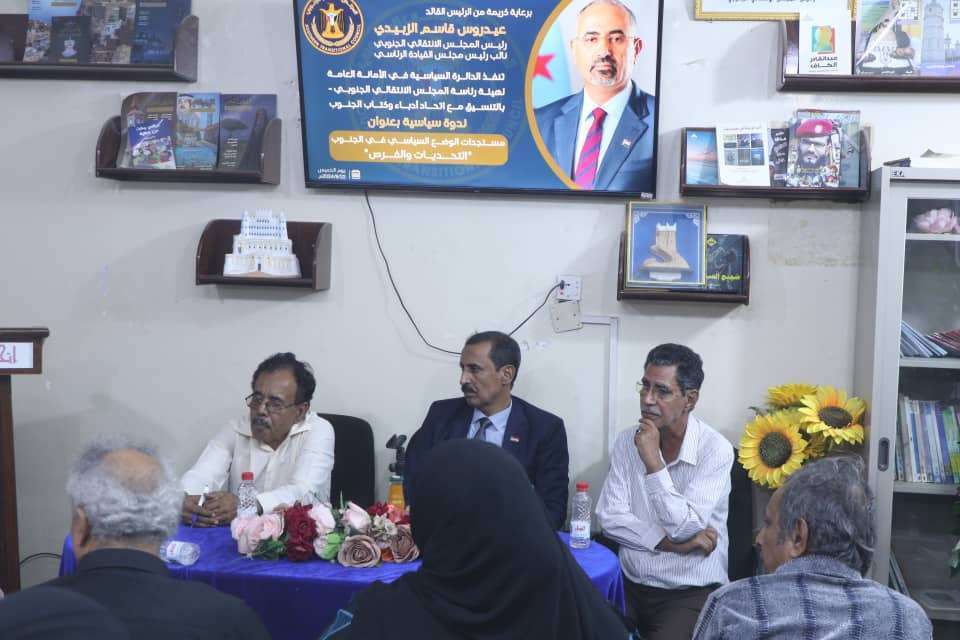 نظمت الدائرة السياسية في الأمانة العامة لهيئة رئاسة المجلس الانتقالي الجنوبي، اليوم الجمعة، ندوة سياسية بعنوان "مستجدات الوضع السياسي في الجنوب: التحديات والفرص"، بالشراكة مع اتحاد أدباء وكتاب الجنوب.