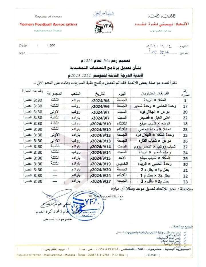 أصدر فرع إتحاد كرة القدم بساحل حضرموت برنامج تعديل لمباريات التصفيات التمهيدية لدوري أندية الدرجة الثالثة لكرة القدم للموسم الرياضي