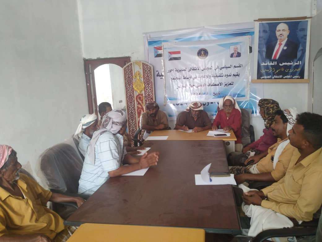 نظم القسم السياسي بالهيئة التنفيذية للقيادة المحلية للمجلس الانتقالي الجنوبي في مديرية أحور بمحافظة أبين، اليوم الأربعاء، ندوة سياسية بعنوان "نشر الوعي السياسي والاصطفاف الجماهيري والشعبي حول المجلس الانتقالي الجنوبي".