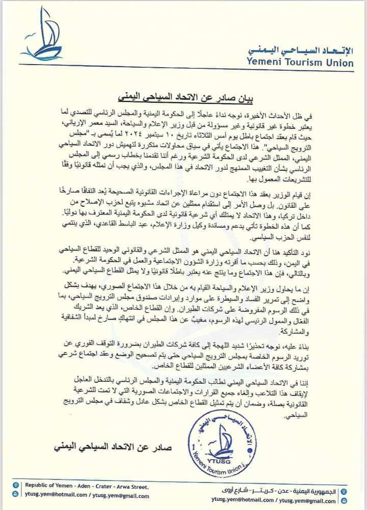 في ظل الأحداث الأخيرة، نوجه نداءً عاجلًا إلى الحكومة اليمنية والمجلس الرئاسي للتصدي لما يعتبر خطوة غير قانونية وغير مسؤولة من قبل وزير الإعلام والسياحة، السيد معمر الإرياني، حيث قام بعقد اجتماع باطل يوم امس الثلاثاء تاريخ 10 سبتمبر 2024 لما يُسمى بـ "مجلس الترويج السياحي".
