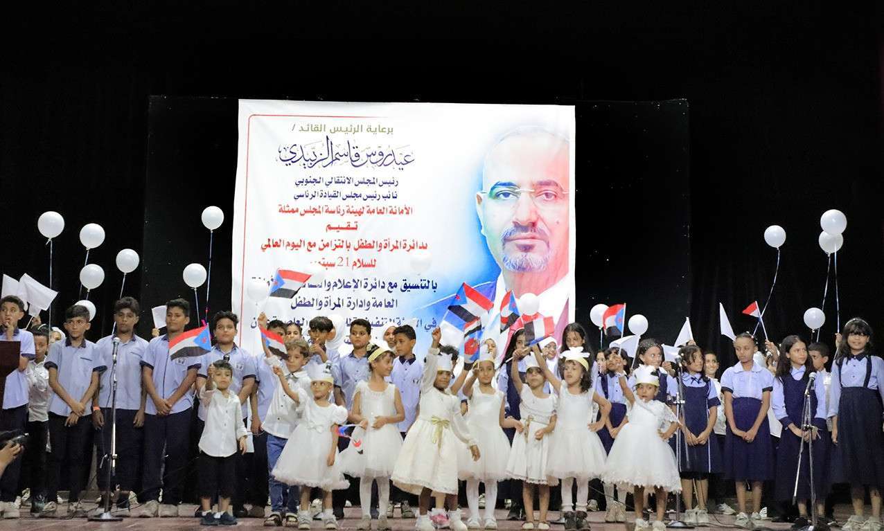 نظمت دائرة المرأة والطفل في الأمانة العامة لهيئة رئاسة المجلس الانتقالي الجنوبي، يوم الاربعاء في العاصمة عدن، حفلًا فنياً بمناسبة اليوم العالمي للسلام، برعاية الرئيس القائد عيدروس الزُبيدي رئيس المجلس الانتقالي الجنوبي.