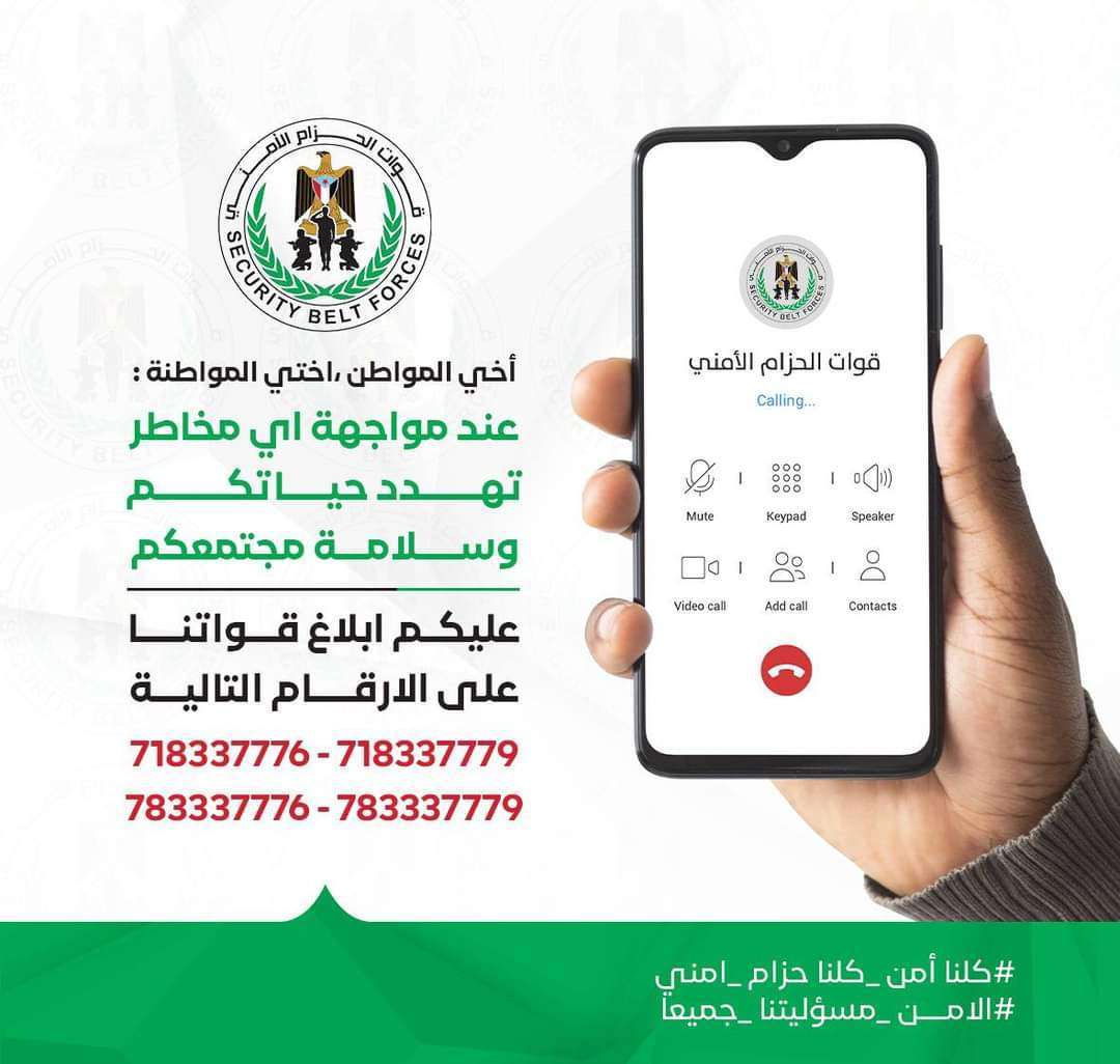 وقالت قوات الحزام الأمني في إعلانها: نحن نعلم بأن المواطن هو رجل الأمن الأول؛ وحرصًا على أمن الوطن والمواطن، نضع بين أيديكم أرقام الخطوط الساخنة؛ للإبلاغ عن الشكاوي والمخالفات القانونية.