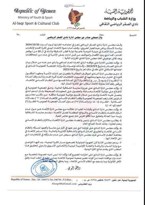 حيث أكد مجلس الإدارة على موقفه الذي اتخذه العام الماضي والذي عبر عنه من خلال بيان النادي الصادر بتاريخ 2023/9/9 ، وكذلك توصيات وقرارات الجمعية العمومية للنادي في اجتماعها الاستثنائي الذي عقد في منتزه تعز بتاريخ 2023/10/4.