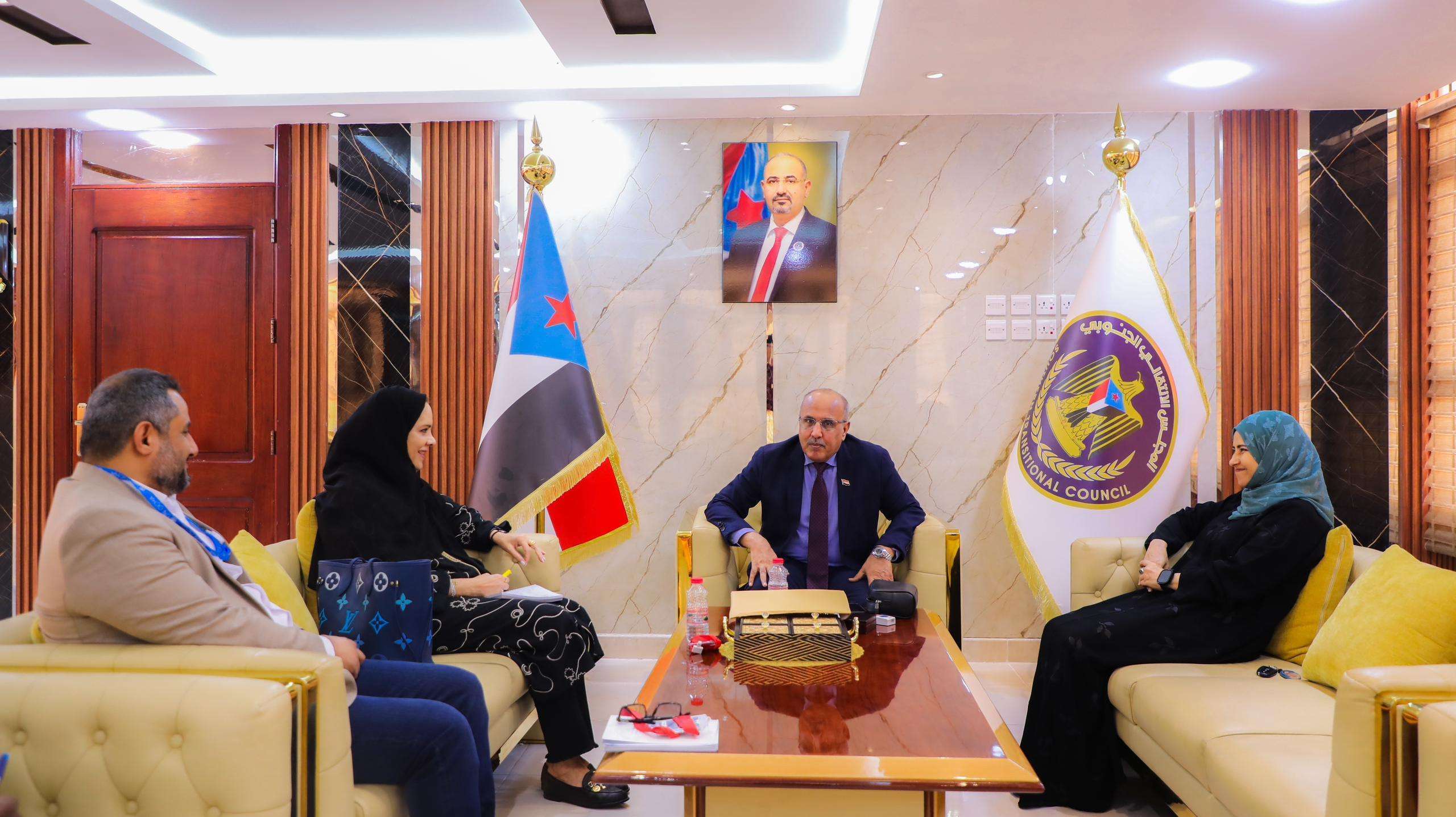 وبحث اللقاء سُبل تعزيز العمل الإنساني في العاصمة عدن وبقية محافظات الجنوب والمناطق المحررة، والحلول العاجلة لمشكلة تدفق النازحين ودعم المجتمع المضيف، وإعادة التوازن في الدعم المقدم من الجهات المانحة بين محافظات الجنوب والشمال، وتسهيل العودة الطوعية للنازحين إلى المناطق الآمنة.