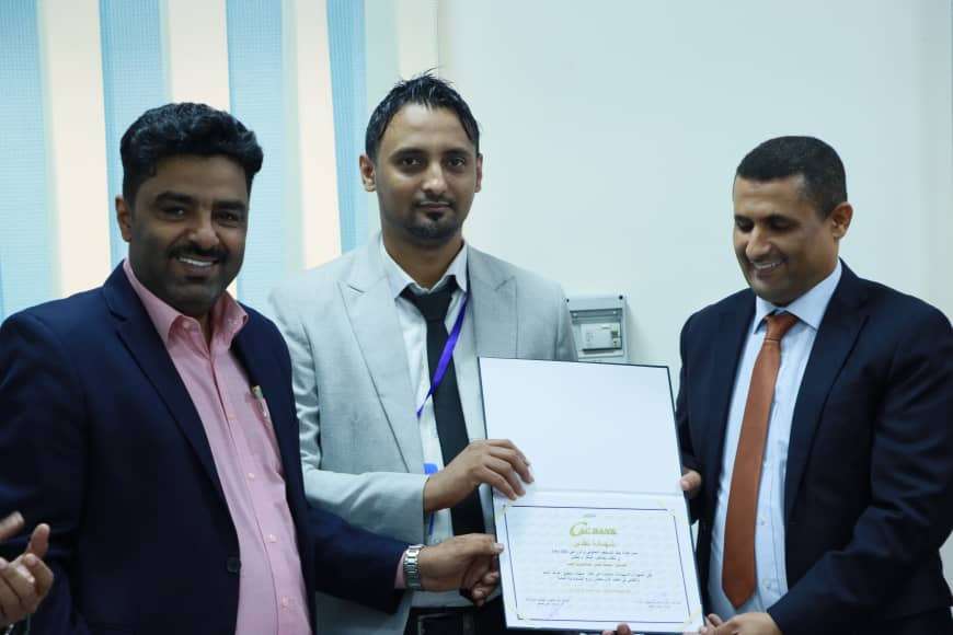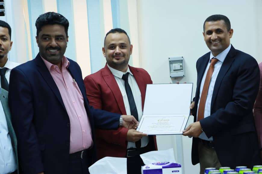وبالنيابة عن القائم بأعمال رئيس مجلس الإدارة، الرئيس التنفيذي، الأستاذ / حاشد الهمداني، قام نائب الرئيس التنفيذي لقطاع العمليات المصرفية، الأستاذ/ رفيق القباطي، ونائب الرئيس التنفيذي لقطاع الاستثمار الاستاذ/ جهاد الحكيمي، ومدير إدارة الموارد البشرية منصر جميع، بتكريم الموظفين.