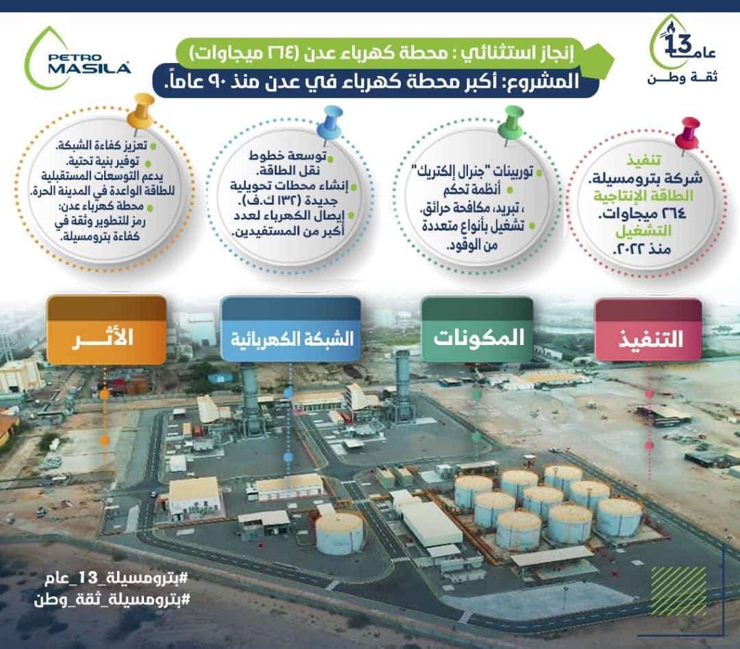تضم المحطة وحدتين متقدمتين من توربينات جنرال إلكتريك، إلى جانب أنظمة متكاملة للتحكم والتبريد ومكافحة الحرائق، مع مرونة تشغيلها بأنواع متعددة من الوقود. كما أشرفت بترومسيلة على توسعة منظومة نقل الطاقة بتمويل كامل من الدولة شملت خطوط نقل الطاقة ومحطات تحويلية جديدة في مناطق: (الحسوة، المنصورة، وخور مكسر) الأمر الذي يعزز كفاءة الشبكة الكهربائية ويضمن وصول الطاقة لأكبر عدد من المستفيدين في عدن والمناطق المحيطة.