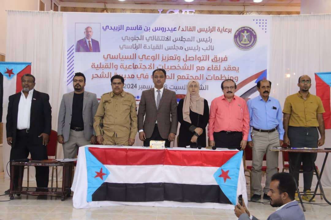 عقد فريق التواصل وتعزيز الوعي السياسي بالمجلس الانتقالي يعقد، برئاسة عضو هيئة الرئاسة، الأستاذ فادي حسن باعوم، يوم السبت، لقاءً موسعاً بالشخصيات الأجتماعية والقبلية ومنظمات المجتمع المدني بمدينة الشحر.