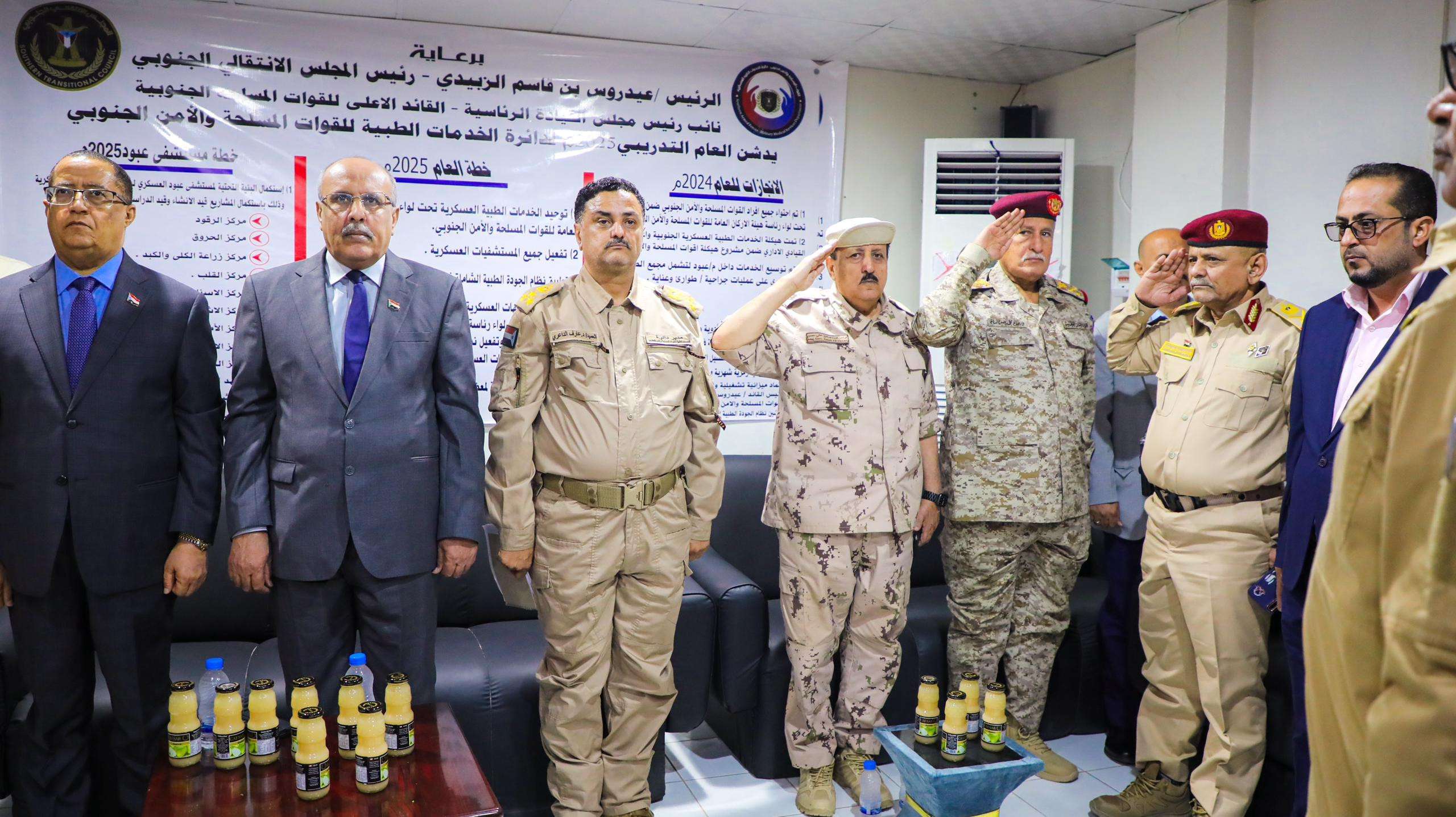 كما ألقى العميد الدكتور عارف الداعري، كلمة استعرض خلالها إنجازات الدائرة الطبية للقوات المسلحة والأمن الجنوبي للعام الماضي 2024م، وخطط العام القادم 2025م لمعظم المستشفيات العسكرية الجنوبية بمحافظات الجنوب، وخطة استكمال البنية التحتية لمستشفى عبود العسكري ليكون نواة لمدينة طبية عسكرية تشمل الجميع، وتوفر جميع الخدمات الطبية، تحت دائرة عمليات مشتركة واحدة.