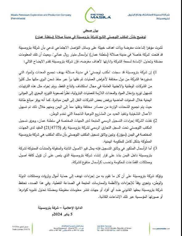 نفذت الشركة إجراءات التسجيل الرسمي المتبعة لدى الجهات المختصة في سلطنة عمان، وجرى تسجيل المكتب اللوجستي تحت السجل التجاري الرسمي لشركة بترومسيلة رقم (4775/21) المقيد لدى الجهات المختصة في اليمن (سيؤون). وتبين وثائق تسجيل المكتب اللوجستي بأن مالك المكتب هي شركة بترومسيلة المملوكة بشكل كامل للحكومة اليمنية.