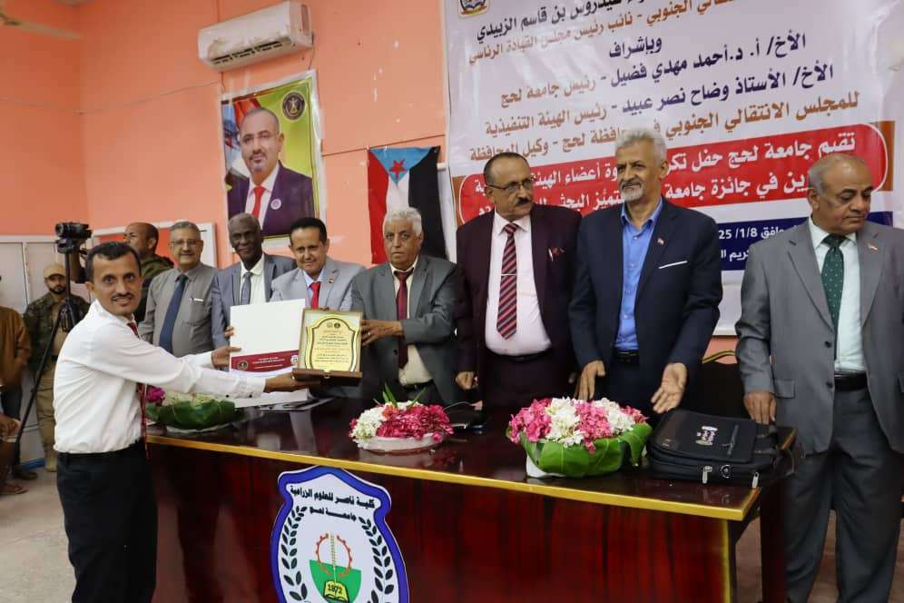 وأوضح رئيس تنفيذية انتقالي لحج، وضاح الحالمي، أن البحث العلمي يعتبر النواة الأساسية لتقدم الأمم وتعزيز نهضتها، واستثمار حقيقي للعقول المبدعة، معبراً عن اعتزازه بتكريم الكوكبة المتميزة من أعضاء هيئة التدريس باعتبارهم يشكلون أمل الجنوب في تحقيق التطور والإزدهار بأعمالهم البحثية التي سيعتمد عليها في تحقيق التنمية المستدامة.