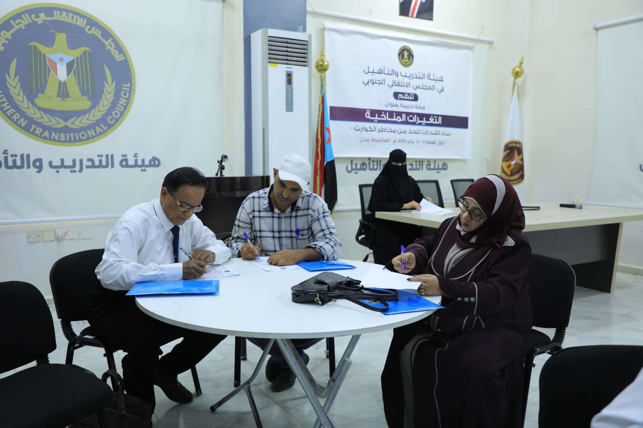 نظمت هيئة التدريب والتأهيل المساعدة لهيئة رئاسة المجلس الانتقالي الجنوبي، يوم الاثنين، ورشة تدريبية بعنوان "التغيرات المناخية: بناء القدرات للحد من مخاطر الكوارث"، استهدفت عددا من أعضاء لجنة البيئة والسكان في مجلس المستشارين.