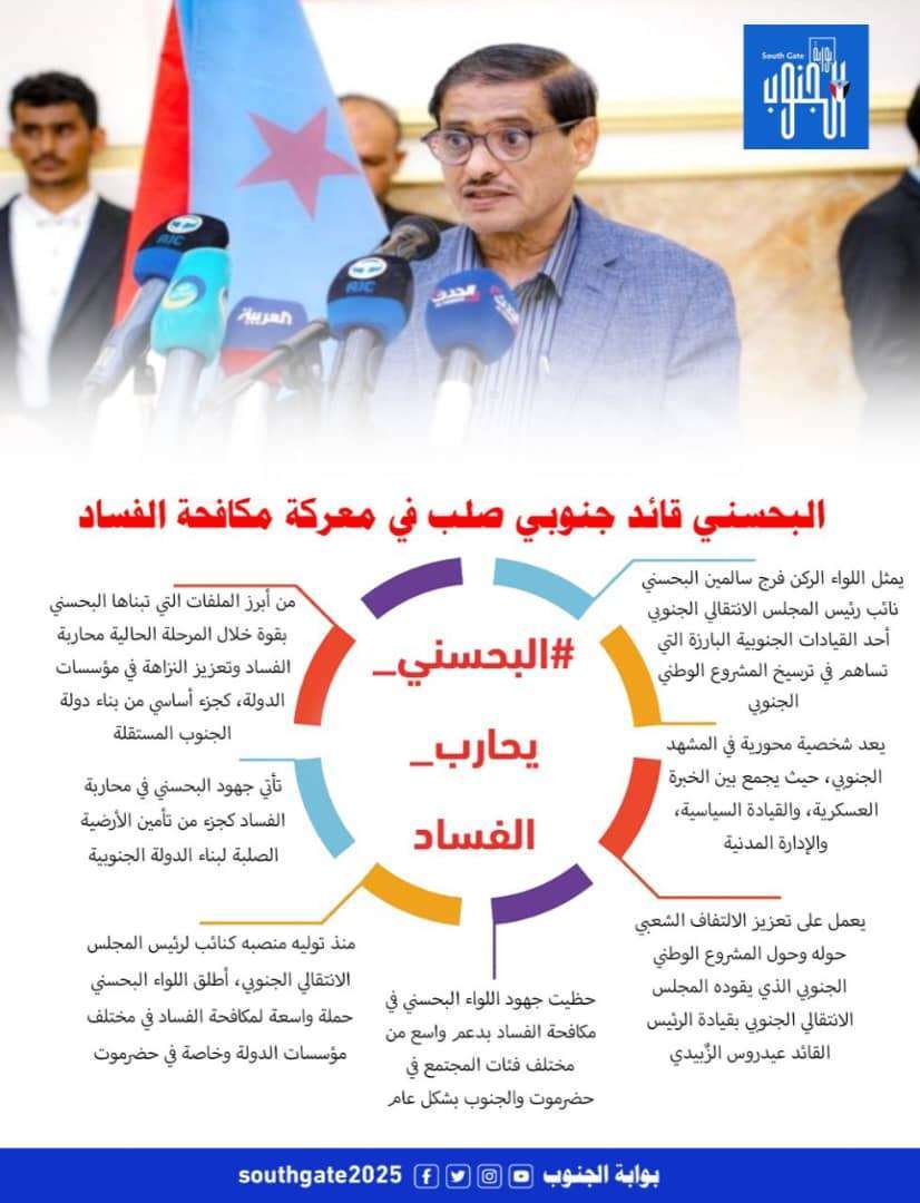 جنوبيون أكدوا على أن الجنوب يرفض كافة أشكال الفساد. مشيدين بجهود اللواء البحسني الرامية إلى تعزيز الشفافية والمساءلة، وتحقيق العدالة والاستقرار في المجتمع. مشيرين بأن نائب الرئيس فرج البحسني كقائد جنوبي صلب يقود معركة ضد الفساد، وتعزيز الالتفاف الشعبي حوله وحول المشروع الوطني الجنوبي الذي يقوده المجلس الانتقالي الجنوبي بقيادة الرئيس القائد عيدروس الزٌبيدي لاستعادة دولة الجنوب كاملة السيادة على حدودها المتعارف عليها دوليا قبل عام 1990م.