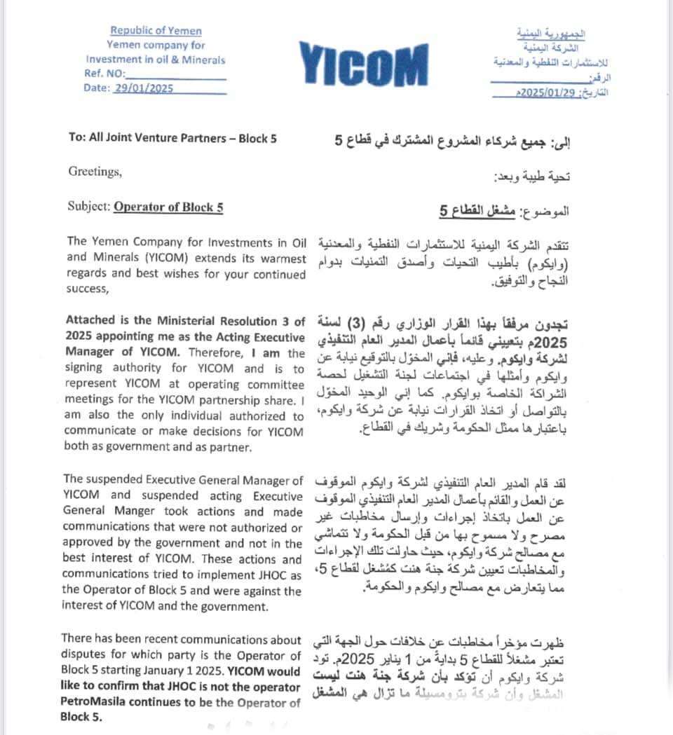 في خطاب رسمي إلى الشركاء في قطاع 5 النفطي، أكد - ابن شبوة- الأستاذ هاني صالح العشلة، القائم بأعمال المدير العام التنفيذي لشركة وايكوم بأن شركة بترومسيلة ما تزال هي المشغل القانوني لقطاع 5، مصححا بذلك مسار إدارة شركة وايكوم التي خالفت خلال الفترة الماضية الاتفاقيات الموقعة مع الشركاء وكذلك قرارات وتوجيهات الدولة (ممثلة برئيس الوزراء ووزير النفط) بهذا الشأن.