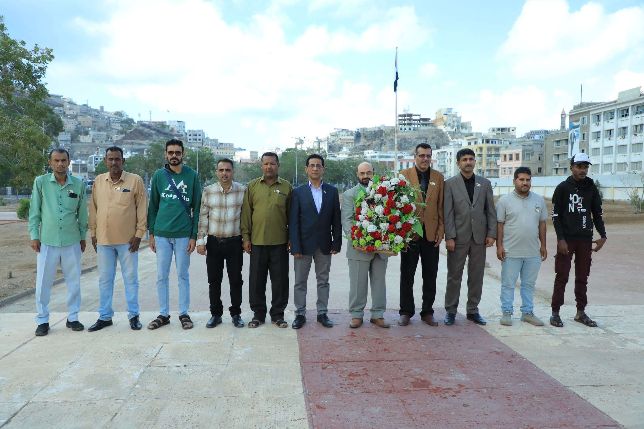 حيث قام الأستاذ عبده علي النقيب، مساعد الأمين العام للأمانة العامة، بوضع إكليل من الزهور أمام النصب التذكاري للجندي المجهول، والوقوف دقيقة حداد، وقراءة سورة الفاتحة على أرواح شهداء الجنوب، داعياً المولى عز وجل بأن يتغمدهم بواسع رحمته، وأن يسكنهم الجنة مع الأنبياء والصديقين.