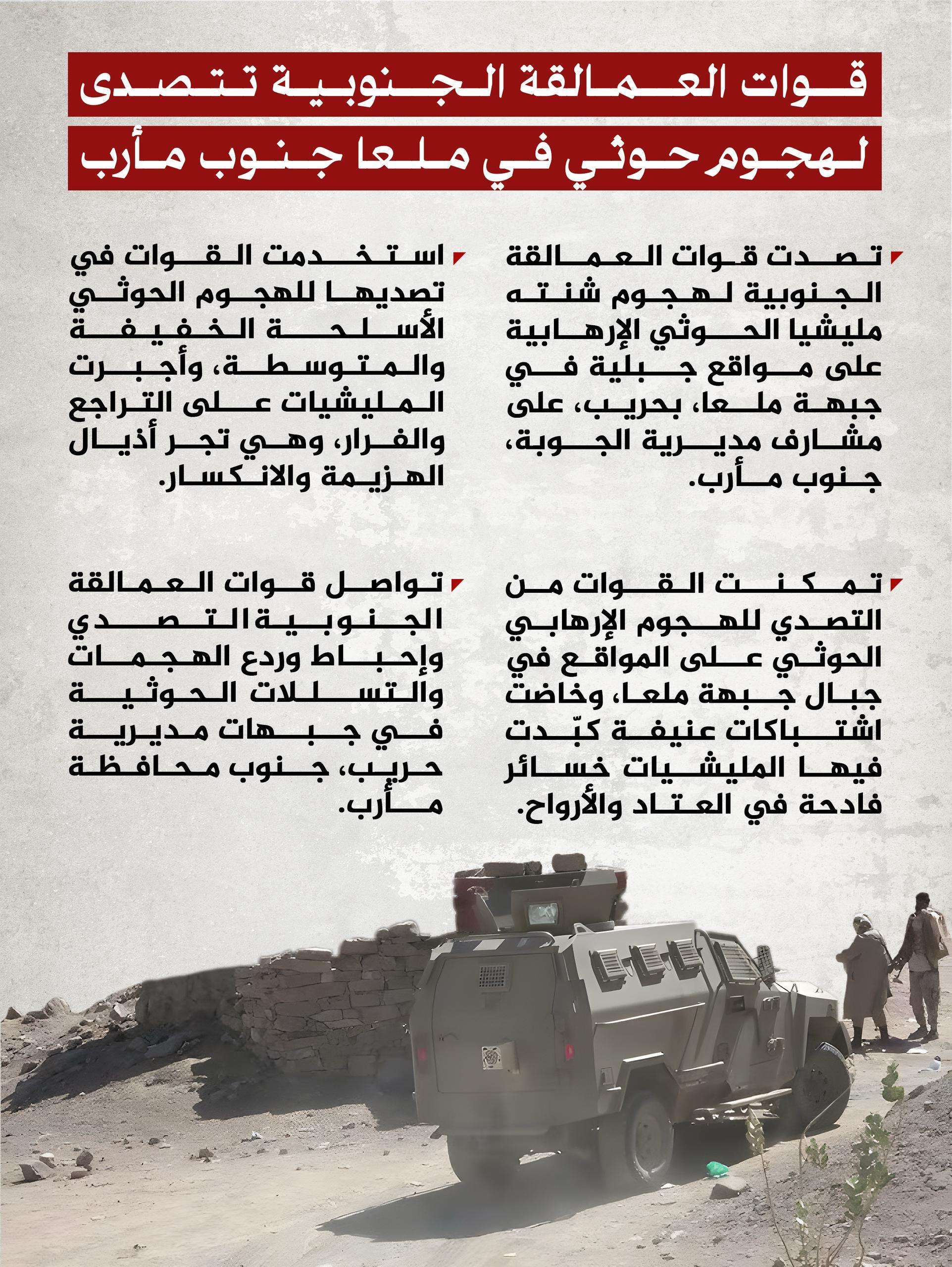 وتواصل قوات العمالقة الجنوبية التصدي وإحباط وردع الهجمات والتسللات الحوثية في جبهات مديرية حريب، جنوب محافظة مأرب.
